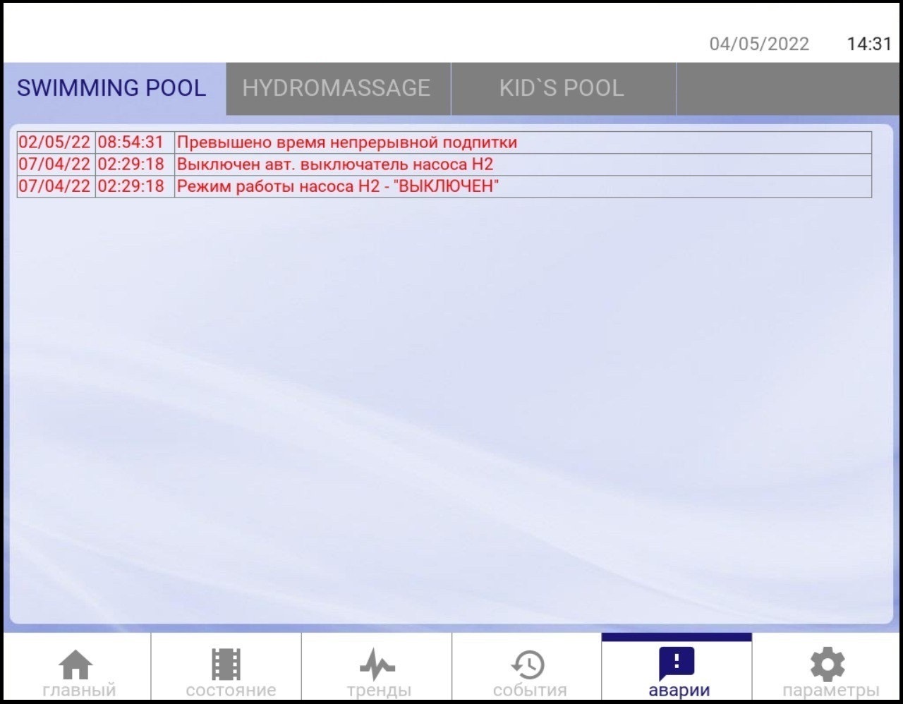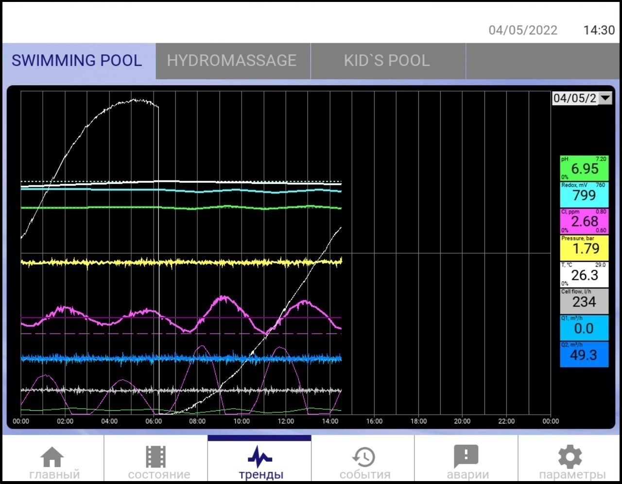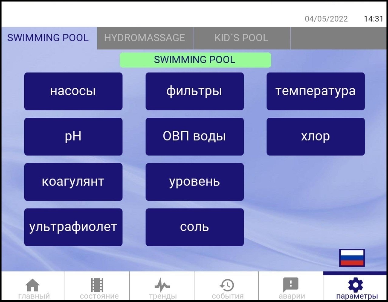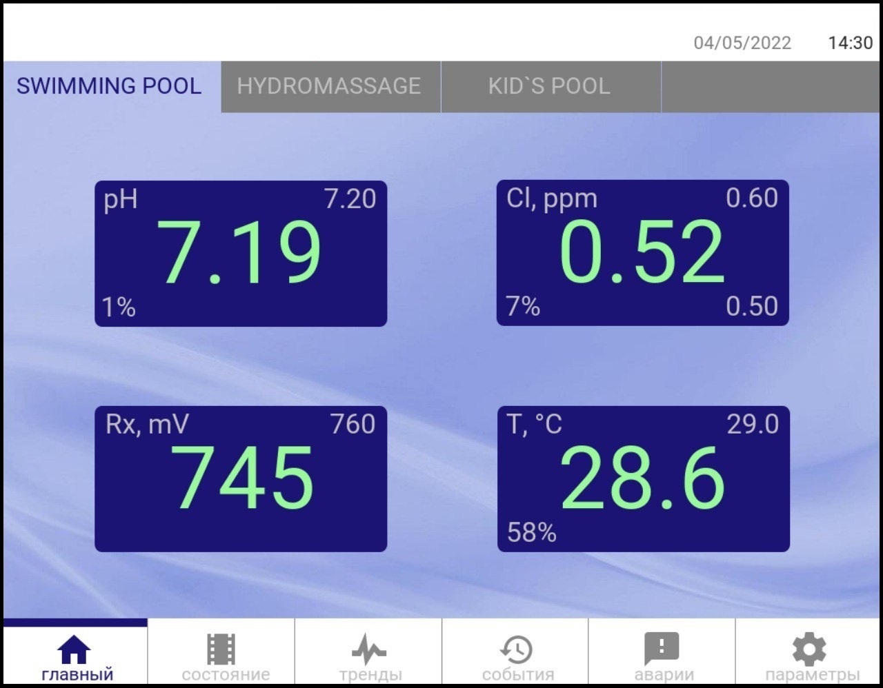 Визуализация параметров состояния воды в выбранном бассейне, навигация по меню