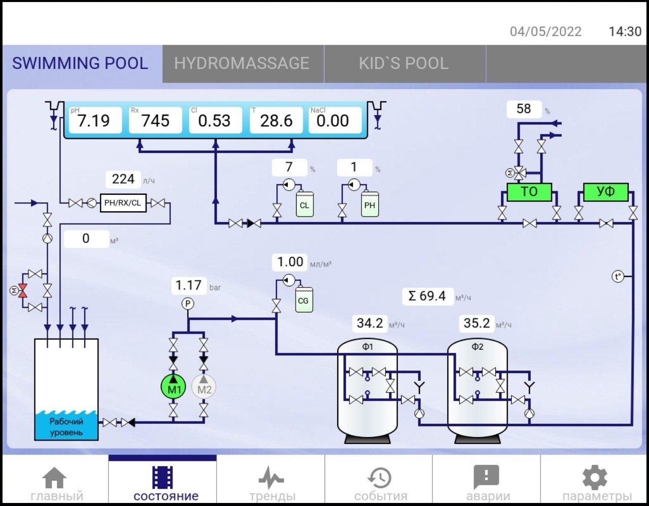 - комплексная автоматизация полного цикла технологического процесса водоподготовки от 1-го до 3-х бассейнов
